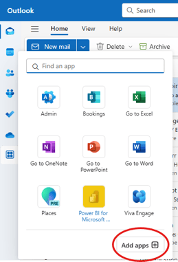 - Open Outlook. Click apps -> add apps